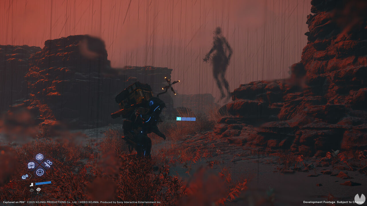 Como esas escenas no son prerrenderizadas, abunda el director, también se alteran dependiendo de la hora del mundo, del equipamiento y de la vestimenta de Sam, y por los fenómenos climatológicos. En DS2: On the Beach hay tormentas de distinto tipo, lluvias torrenciales y otros eventos que afectan a la partida tanto o más como hacer una entrega durante el día o la noche (en la oscuridad, los enemigos humanos tendrán más dificultades para detectarnos, pero quizá nos sea más difícil huir de los Entes Varados).