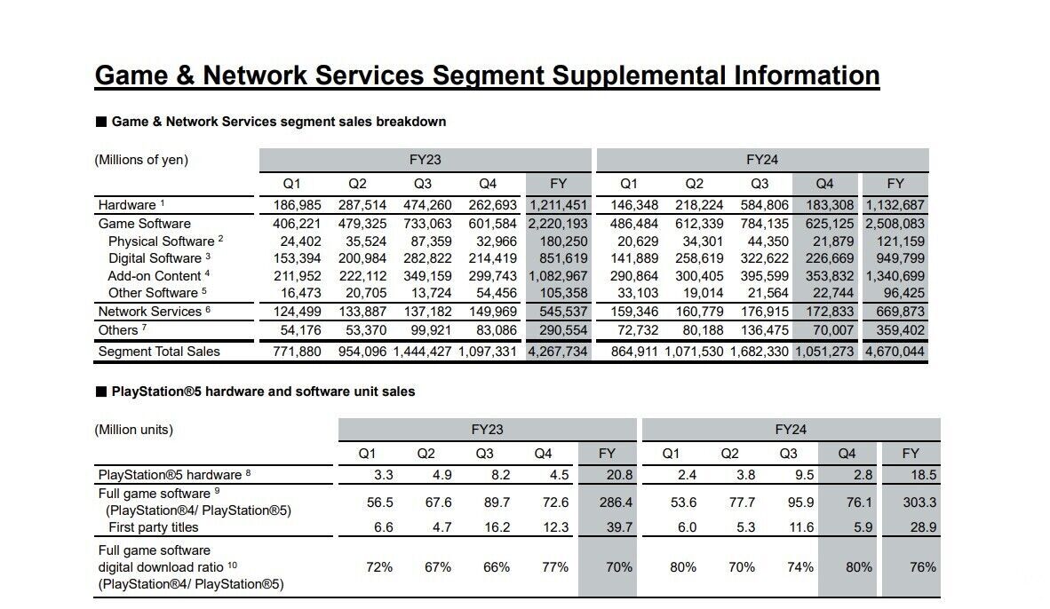 En total, tanto en físico como en digital, este año se han vendido 303,3 millones de videojuegos para PS5 y PS4 (28,9 millones de juegos editados por Sony), un incremento respecto al año fiscal anterior: entre el 1 de abril de 2023 y el 31 de marzo de 2024 se vendieron 286,4 millones de juegos, pero más de ellos eran first party, un total de 39,7 millones.
