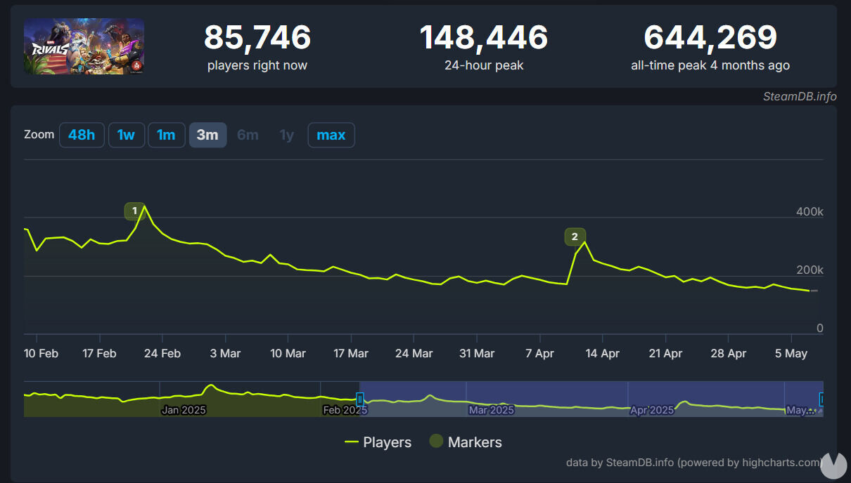 Según los datos publicados en Steamdb, Marvel Rivals tuvo su pico máximo de jugadores el pasado 11 de enero con 644.269 jugadores simultáneos, un dato que servía como demostración de que el género hero shooter no está muerto, solamente hay que acertar con el producto para llamar la atención de los jugadores. NetEase Games, en ese sentido, siempre lo ha tenido más fácil gracias a la popularidad de los personajes de la Casa de las Ideas y el resurgimiento reciente del UCM.